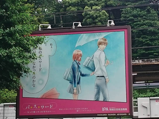 The impact of manga and anime manifests itself on several levels. Images from well-known old anime series are used. Characters from popular new anime and manga are common. The iconic illustration style is used for public awareness ads such as ones that encourage trendy teens to use the metro and ones that encourage them to protect their password. The unique fashions found in manga has trickled its way to the mainstream and is showcased in the outdoor advertising of big brands such as Shiseido. Firms have created their own mascots in the recognisable style. Shops even have people dressed up like manga characters outside to encourage people to step inside.
