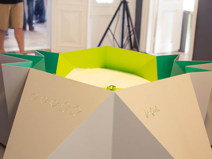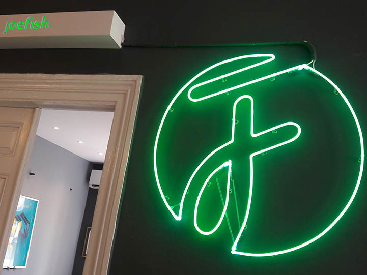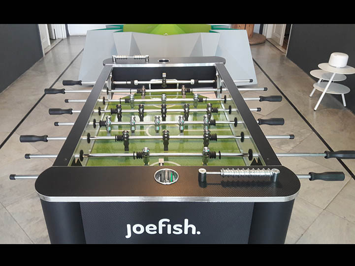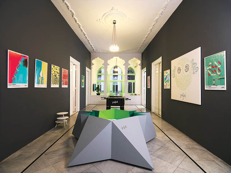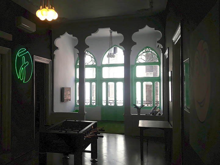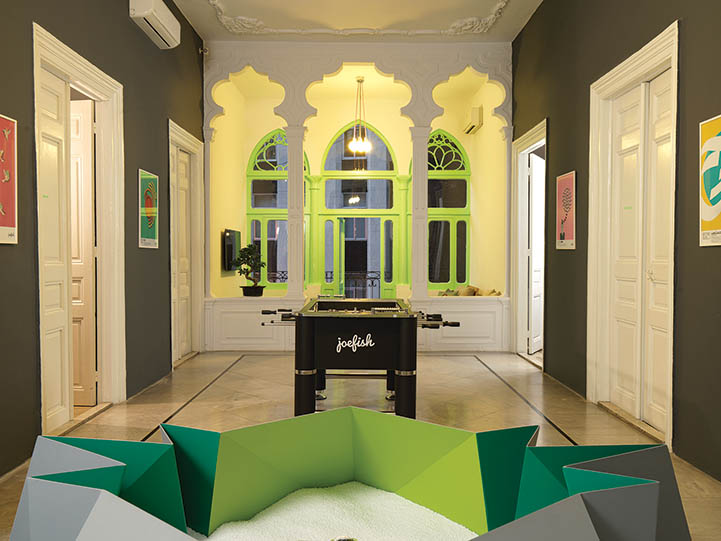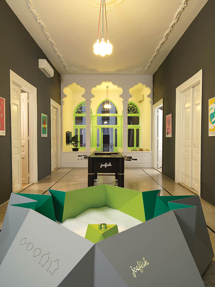 The result is stunning crossover. A typical Lebanese house with high ceilings; columns and balconies got a Pop Art make-over. Warm light streams through giant arched windows. A little colonnade separates the sun kissed anti-chamber from the central space. The walls are painted green. The visitor is greeted by a strange metal starfish. It used to be a wishing fountain for charity, inviting people to toss a coin for a wish upon a star. It’s a lovely designed piece, a true sculpture, now filled with little polystyrene pellets. Next to it is the must-have numero uno of every creative department: the football table. This one, made of shiny metal with glittering players and roundish score counter looks more of an object d’art. It even comes with the agency logo, playfully illustrating the agency’s sense for ‘branding.’ A neon Joe Fish sign completes the corner of cool.