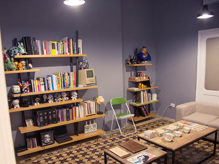 The creatives are grouped in the next room. Client service is sitting in an identical room on the opposite side. Both spaces are equipped with faux-ceilings to keep warm in winter. The pièce de résistance is the meeting room, which looks more like a living room. No glass meeting table, no leather chairs, just an L shaped sofa and a table basse. Shelves are filled with books, a Superman bust, a prehistoric Mac, zillions of figurines and strangely decorated dolls.